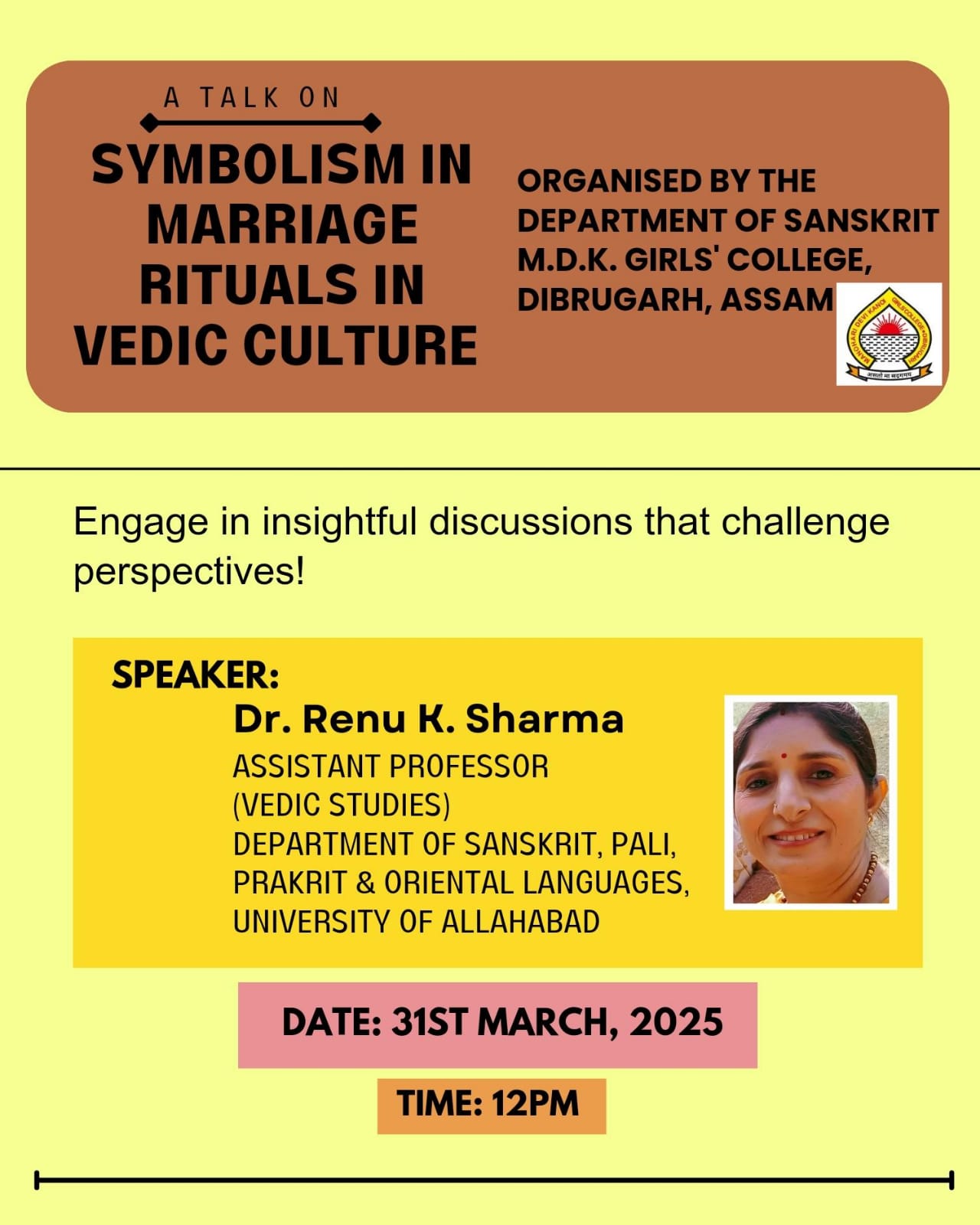 Under the initiative of Cultural committee, MDKG College, joyfully Celebrated Basanta Utshav, 2025 on 9th April. The occasion was inaugurated by Dr. Anupjyoti Bharali, Principal of MDKG College . All the faculties enthusiastically participated and made it a grand success. মনোহাৰী দেৱী কানৈ মহিলা মহাবিদ্যালয়ৰ সাংস্কৃতিক সমিতিৰ উদ্যোগত আড়ম্বৰপূৰ্ণ ভাৱে ৯ এপ্ৰিল , ২০২৫ তাৰিখে বসন্ত উৎসৱ উদযাপন কৰা হয় ৷ মনোহাৰী পৰিয়ালৰ সকলো সদস্যই এই অনুষ্ঠানত সক্ৰিয়ভাৱে অংশগ্ৰহণ কৰি মুখৰিত কৰি তোলে ৷